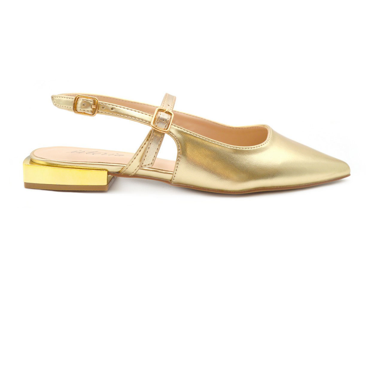 Γυναικείες μπαλαρίνες από δέρμα συνθετικό με συνθετική φόδρα και συνθετική σόλα. Διατίθεται σε χρώμα χρυσό. Γίνε και εσύ κομψή ακόμα και με ένα φλάτ ,κομψό παπούτσι.