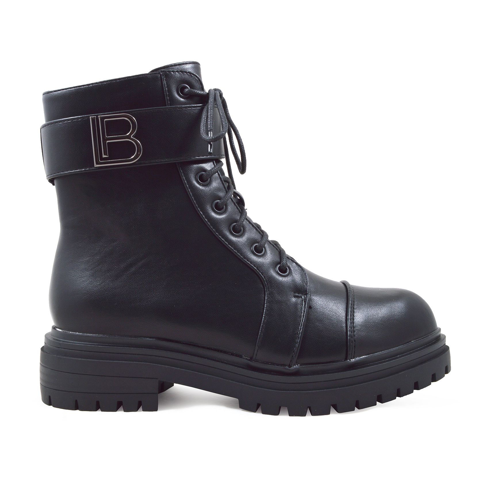 Μποτάκια με την υπογραφή της Laura Biagiotti σε μαύρο χρώμα. Πρόκειται για ιδιαίτερα μποτάκια, κατασκευασμένα εξωτερικά από συνθετικό δέρμα και εσωτερικά από ύφασμα. Δένουν με κορδόνια αλλά έχουν και φερμουάρ στην εσωτερική τους πλευρά και έχουν γλωττίδα στο πίσω μέρος για εύκολη εφαρμογή. Διαθέτουν αντιολισθητική τρακτερωτή σόλα από καουτσούκ. Στο πλαι υπάρχει μεταλλικό patch με το logo της Laura Biagiotti.
