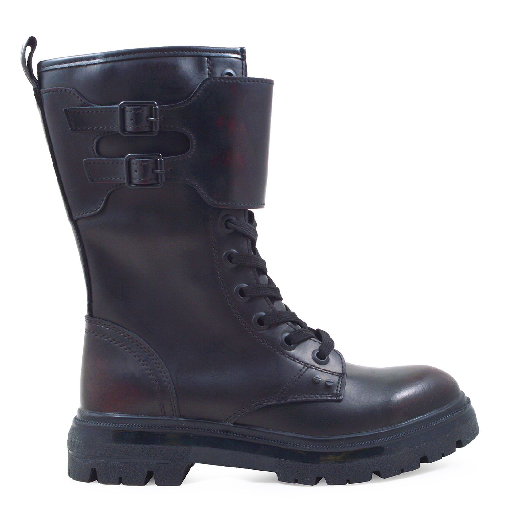 Ψηλά αρβυλάκια Wrangler από επικαλυμμένο δέρμα με λεπτομέρειες σε κόκκινες αποχρώσεις διασκορπισμένες στην επιφάνεια του παπουτσιού και πλατιά ζώνη στο επάνω μέρος με δύο αγκράφες • Επικαλυμμένο δέρμα • Κόκκινες λεπτομέρειες • Δέσιμο με κορδόνια • Φερμουάρ στο πλάι • Πλατιά ζώνη με δύο αγκράφες στο επάνω μέρος • Λαστιχένια σόλα ύψους 4 εκ.