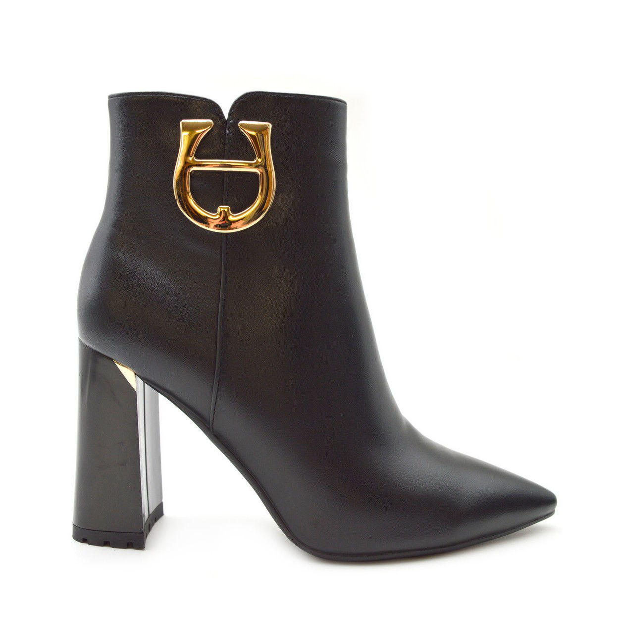Γυναικεία Μποτάκια της Εταιρείας Gianna Kazakou από συνθετικό δέρμα, με συνθετική φόδρα, συνθετική σόλα και τακούνι 9 cm. Διατίθεται σε χρώμα μαύρο με ένα μεταλλικό διακοσμητικό στοιχείο σε χρυσό χρώμα στην εξωτερική πλευρά καθώς και στο τακούνι Είναι πολύ άνετες και σταθερές χάρη στο χοντρό τακούνι. Είναι άκρος θηλυκές για γυναίκες που θέλουν άνεση και στίλ.