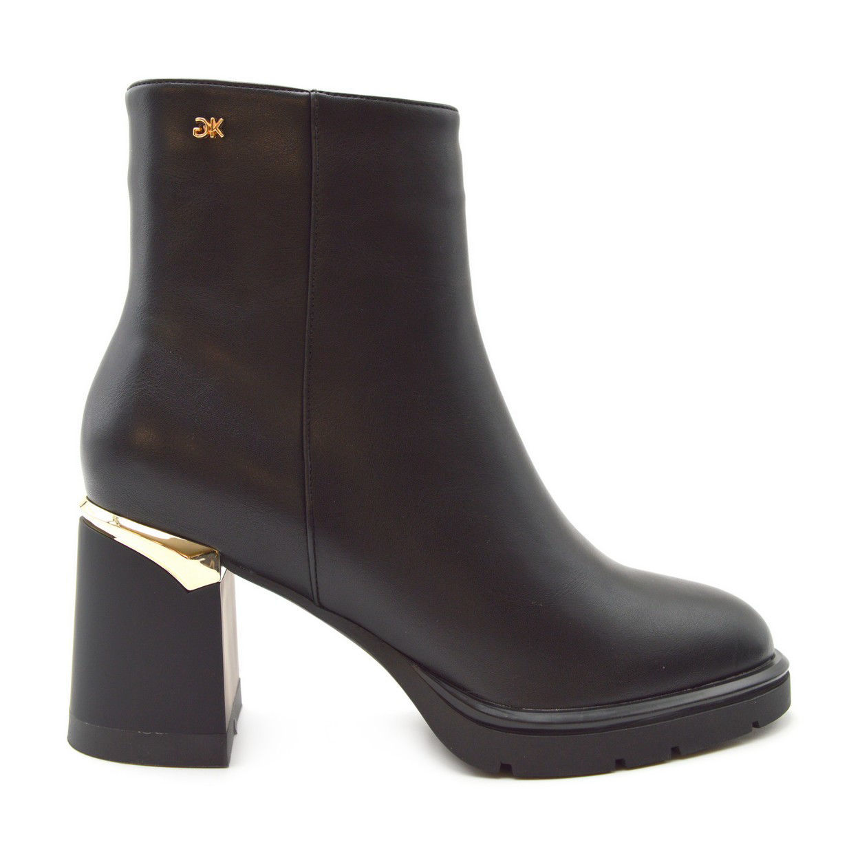 Γυναικεία Μποτάκια της Εταιρείας Gianna Kazakou από συνθετικό δέρμα, με συνθετική φόδρα, συνθετική σόλα και τακούνι 7 cm. και φιάπα 2 cm Διατίθεται σε χρώμα Μαύρο με ένα μεταλλικό στοιχείο σε χρυσό χρώμα στο τακούνι. Είναι πολύ άνετες και σταθερές χάρη στο χοντρό τακούνι. Είναι άκρος θηλυκές για γυναίκες που θέλουν άνεση και στίλ.
