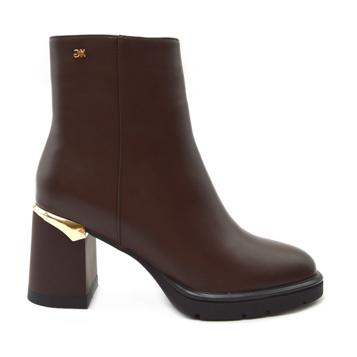 Γυναικεία Μποτάκια της Εταιρείας Gianna Kazakou από συνθετικό δέρμα, με συνθετική φόδρα, συνθετική σόλα και τακούνι 7 cm. και φιάπα 2 cm Διατίθεται σε χρώμα καφέ με ένα μεταλλικό στοιχείο σε χρυσό χρώμα στο τακούνι. Είναι πολύ άνετες και σταθερές χάρη στο χοντρό τακούνι. Είναι άκρος θηλυκές για γυναίκες που θέλουν άνεση και στίλ.