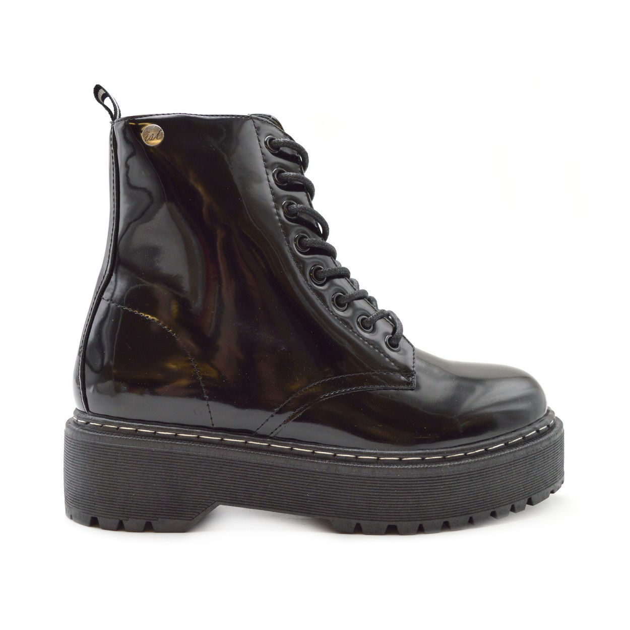 Αρβυλάκια λουστρίνι σε μαύρο χρώμα, Είναι κατασκευασμένο από γυαλιστερό τεχνητό δέρμα λουστρίνι, προσδίδοντας μια κομψή και μοντέρνα εμφάνιση. Διαθέτει τρακτερωτή σόλα, που προσφέρει εξαιρετική πρόσφυση και σταθερότητα. Το αρβυλάκι έχει κορδόνια και φερμουάρ, επιτρέποντας εύκολη εφαρμογή και προσαρμογή στο πόδι, προσφέροντας ευελιξία και άνεση στην καθημερινή χρήση.