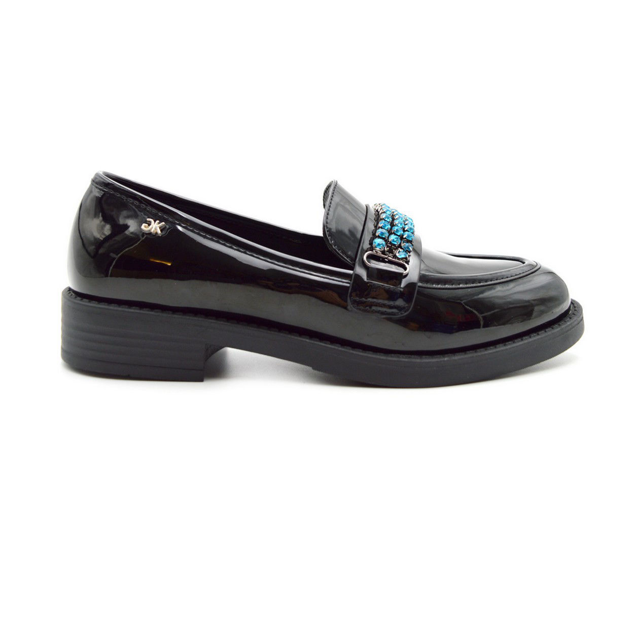 Γυναικεία μοκασίνια της Εταιρείας Gianna Kazakou από λουστρίνι συνθετικο με συνθετική φόδρα, συνθετική σόλα και τακούνι 3 cm. Διατίθεται σε χρώμα Μαύρο με ένα πολύ διακριτικό διακοσμητικό στοιχείο σε Τυρκουάζ χρώμα . Μπορείτε να το συνδυάσετε με κάθε σας outfit από το πρωί μέχρι το βράδυ.