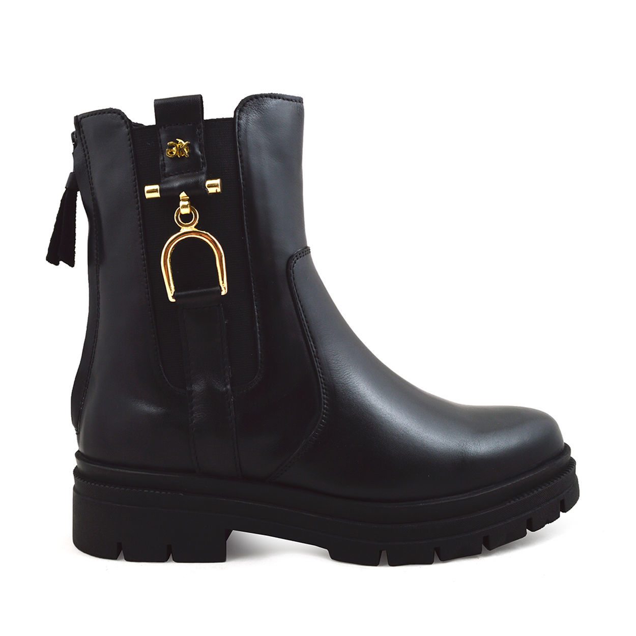 Γυναικεία μποτάκια σε μαύρο χρώμα της εταιρίας Gianna Kazakou από δέρμα με υφασμάτινη φόδρα, συνθετική σόλα και τακούνι 5 cm. Διαθέτει φερμουάρ στο πίσω μέρος,διακοσμητική χρυσή αγκράφα στο πλάι και τρακτερωτή σόλα ,κάνοντάς το πιο σταθερό σε κάθε σας βήμα.
