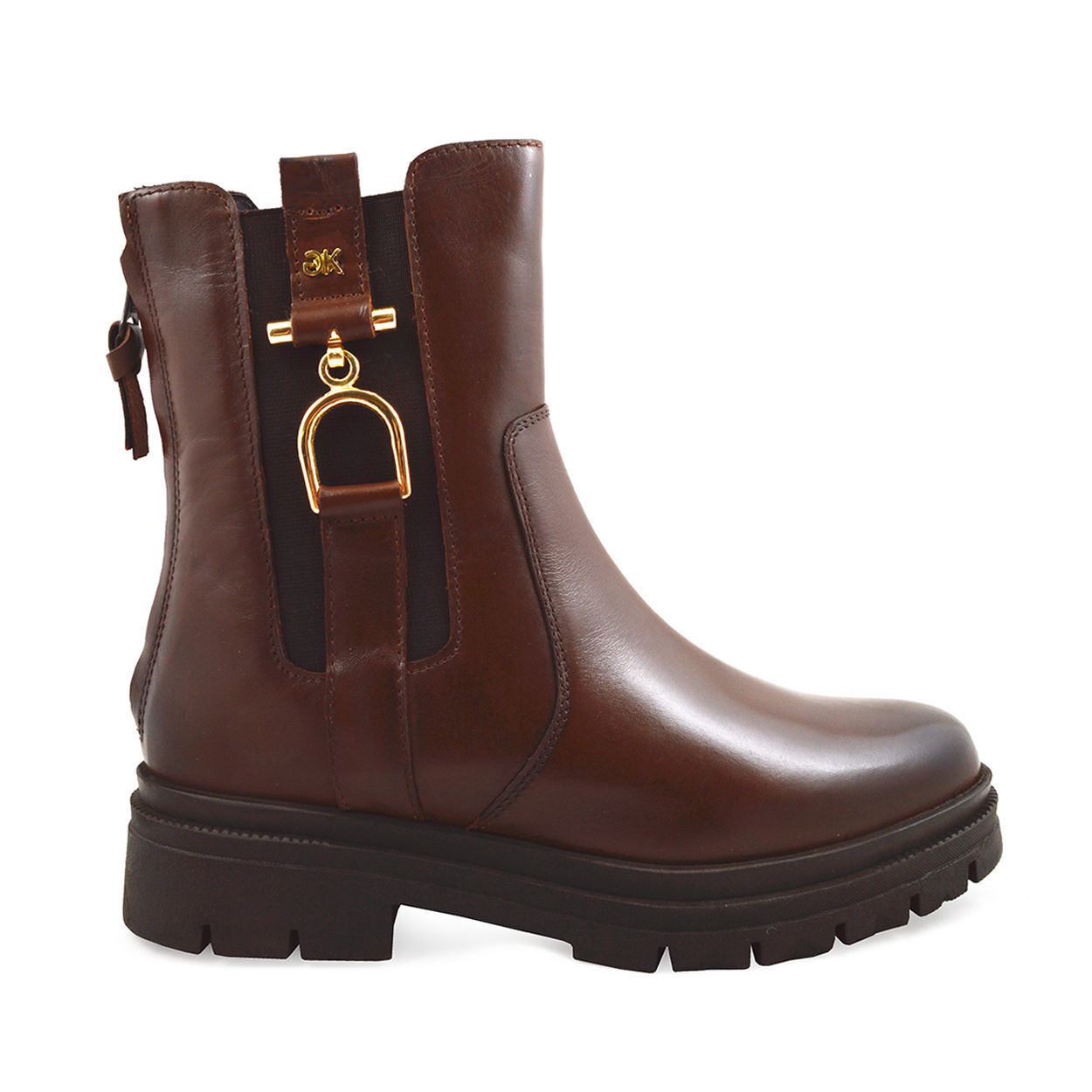 Γυναικεία μποτάκια σε καφέ χρώμα της εταιρίας Gianna Kazakou από δέρμα με υφασμάτινη φόδρα, συνθετική σόλα και τακούνι 5 cm. Διαθέτει φερμουάρ στο πίσω μέρος,διακοσμητική χρυσή αγκράφα στο πλάι και τρακτερωτή σόλα ,κάνοντάς το πιο σταθερό σε κάθε σας βήμα.