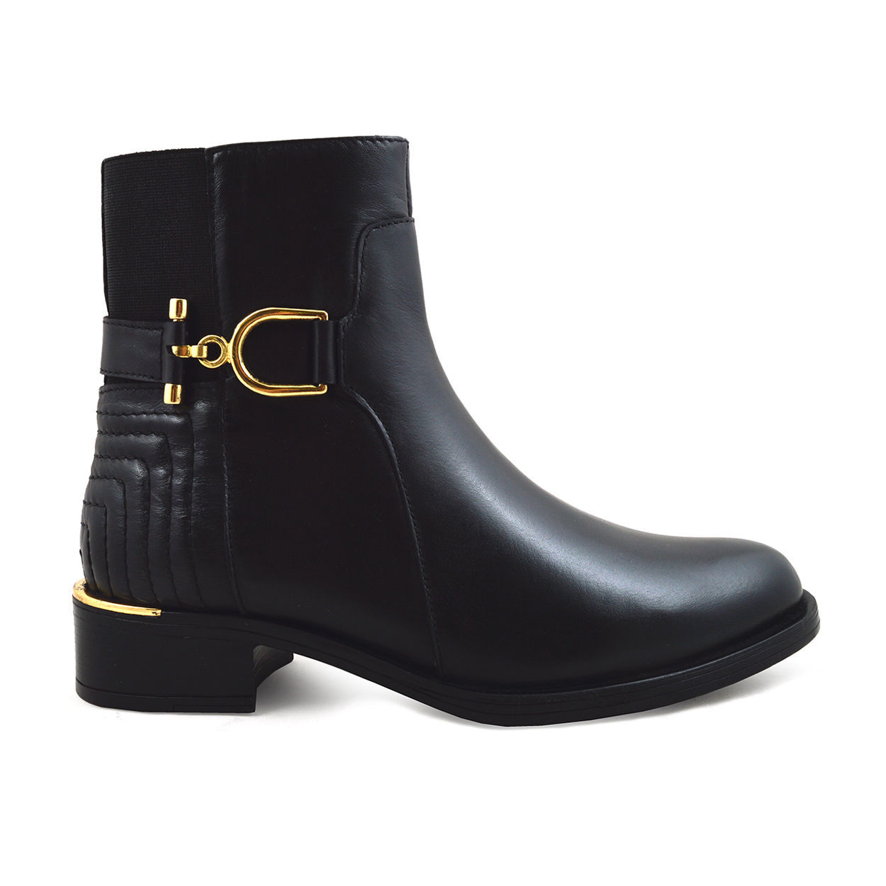 Γυναικεία Μποτάκια της εταιρείας GIANNA KAZAKOU, σε μαύρο χρώμα με χρυσή αγκράφα στον αστράγαλο.Είναι από δέρμα με υφασμάτινη φόδρα, συνθετική σόλα και τακούνι 4 cm.