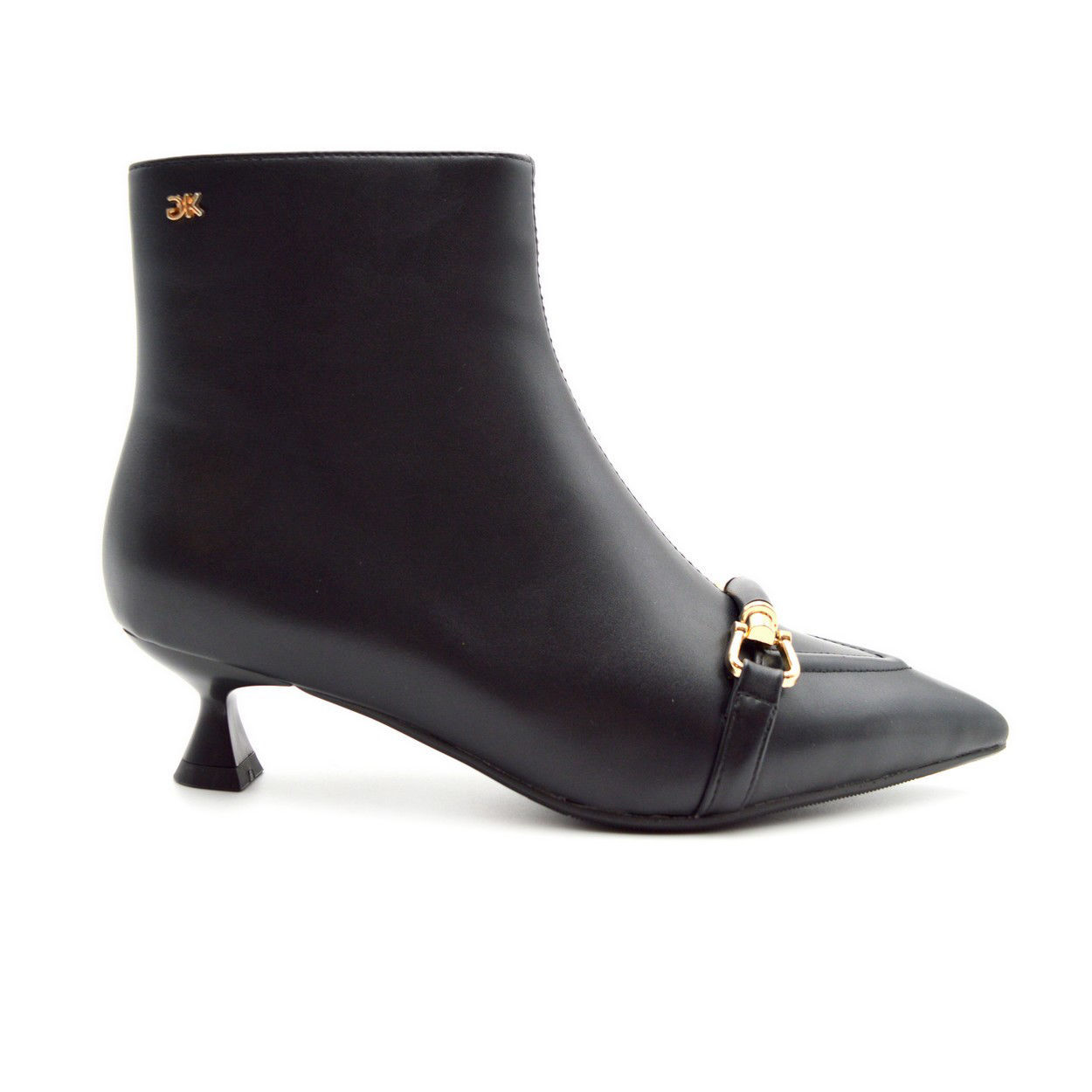 Γυναικεία Μποτάκια της Εταιρείας Gianna Kazakou από συνθετικό δέρμα , με συνθετική φόδρα, συνθετική σόλα και τακούνι 4½ cm Διατίθεται σε χρώμα μαύρο με ένα πολύ διακριτικό μεταλλικό στοιχείο σε χρυσό χρώμα. Είναι πολύ άνετες και σταθερές χάρη στο λεπτό και κοντό τακούνι. Είναι άκρος θηλυκές για γυναίκες που θέλουν να ξεχωρίζουν.