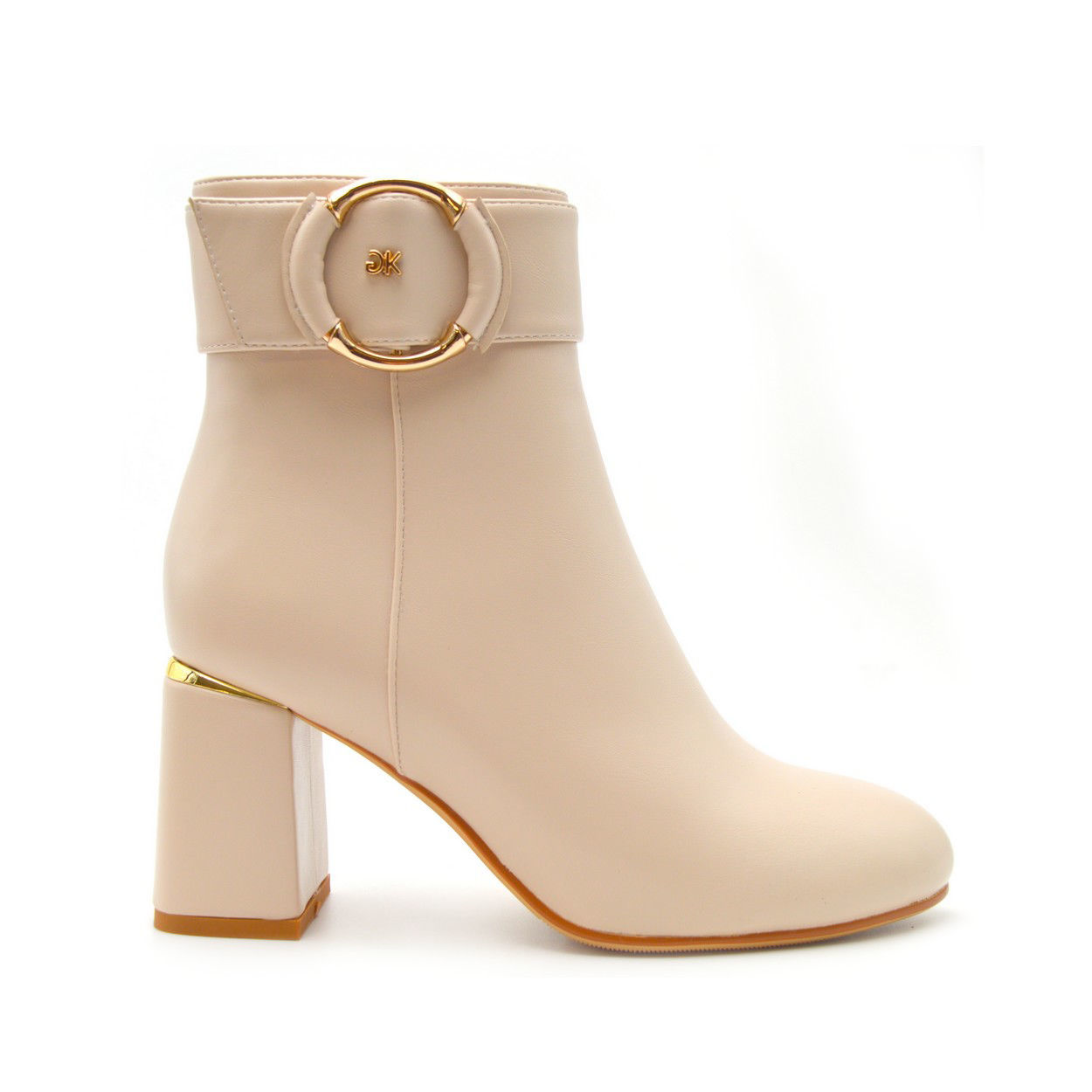 Γυναικεία Μποτάκια της Εταιρείας Gianna Kazakou από συνθετικό δέρμα, με συνθετική φόδρα, συνθετική σόλα και τακούνι 7½ cm. Διατίθεται σε χρώμα Μπέζ με ένα υπέροχο μεταλλικό διακοσμητικό στοιχείο σε χρυσό χρώμα στην εξωτερική πλευρά. Είναι πολύ άνετες και σταθερές χάρη στο χοντρό τακούνι. Είναι άκρος θηλυκές για γυναίκες που θέλουν άνεση και στίλ.