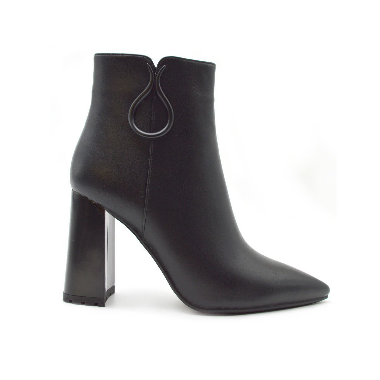 Γυναικεία Μποτάκια της Εταιρείας Gianna Kazakou από συνθετικό δέρμα, με συνθετική φόδρα, συνθετική σόλα και τακούνι 9½ cm Διατίθεται σε χρώμα μαύρο, με ένα πολύ διακριτικό διακοσμητικό σε μαύρο χρώμα. Είναι πολύ άνετες και σταθερές χάρη στο χοντρό τακούνι. Είναι άκρος θηλυκές για γυναίκες που θέλουν άνεση και στίλ.
