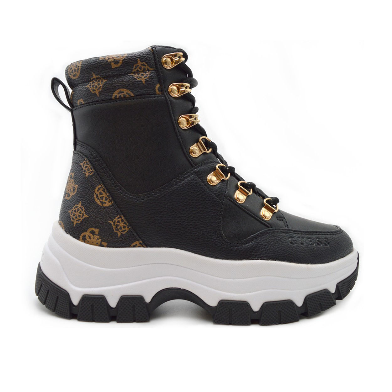 Γυναικεία μποτάκια σε μαύρο χρώμα της εταιρείας GUESS .Αυτό το αθλητικό μποτάκι το κάνει να είναι ξεχωριστό χάρις στον υπέροχο σχεδιασμό του και τα χρώματά του . Συνδυάζει απόλυτα το μαύρο με το καφέ λογότυπο και τις χρυσές λεπτομέρειες. Φέρει πολύ καλό πατάκι στο εσωτερικό για να το φοράτε από το πρωί μέχρι το βράδυ είτε με παντελόνι ,είτε με φούστα.