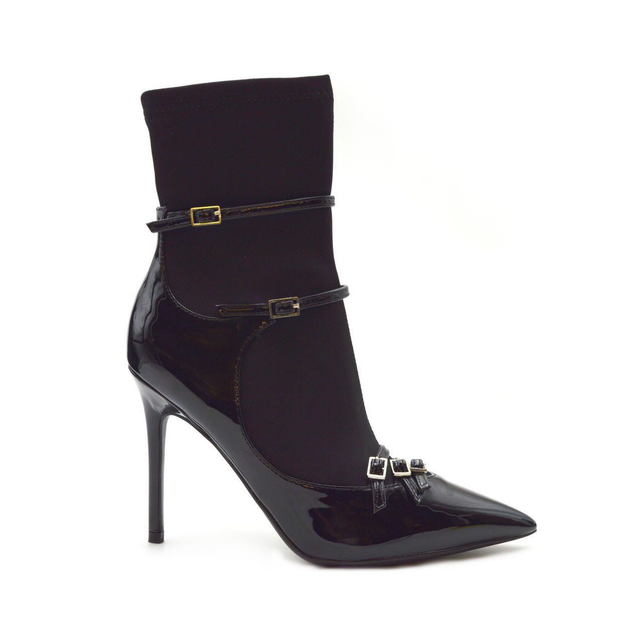 Γυναικεία Μποτάκια της Ιταλικής εταιρείας PRIMADONNA. Η επιτομή της θηλυκότητας χάρη το τακούνι στιλέτο 11 cm , καθώς και της μύτης . Παίζει με δύο υφές. Με το λουστρίνι σαν να είναι μία κανονική γόβα και στο υπόλοιπο κομμάτι έχουμε λάστιχο που φτάνει μέχρι τον αστράγαλο.