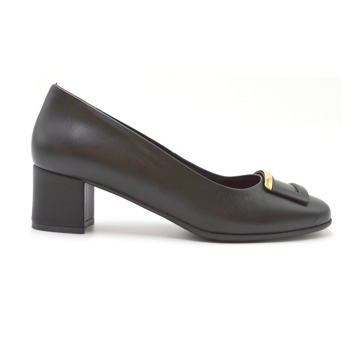 Γυναικείες γόβες, σε μαύρο χρώμα με μεταλλική χρυσή εγκράφα, κατασκευσμένες από γνήσιο δέρμα εξαιρετικής ποιότητας. Η ελληνική εταιρεία Ragazza ειδικεύεται στα ανατομικά παπούτσια ,τα οποία διαθέτουν την τεχνολογία Dryflex στο εσωτερικό τους, πάτος κατασκευασμένος από διαπνέον υλικό για αποφυγή οσμών και απορρόφησης κραδασμών που ενδείκνυται για ατελείωτες ώρες βαδίσματος και άνεσης. Κατάλληλα ακόμα και για τα πιο κουρασμένα πόδια. Διαθέτουν τακουνάκι ύψους 5 cm.